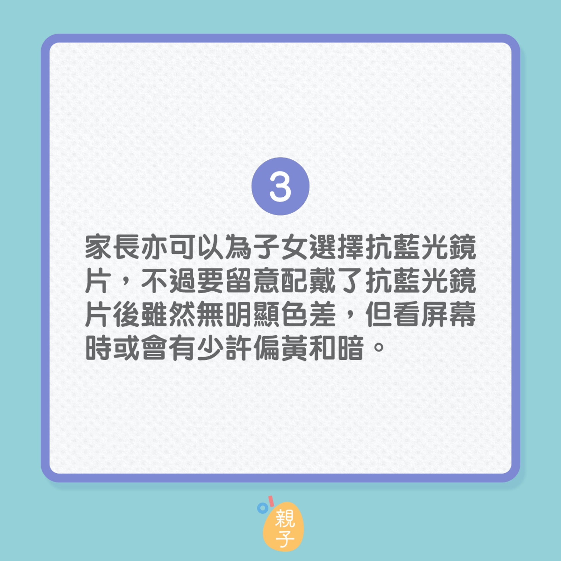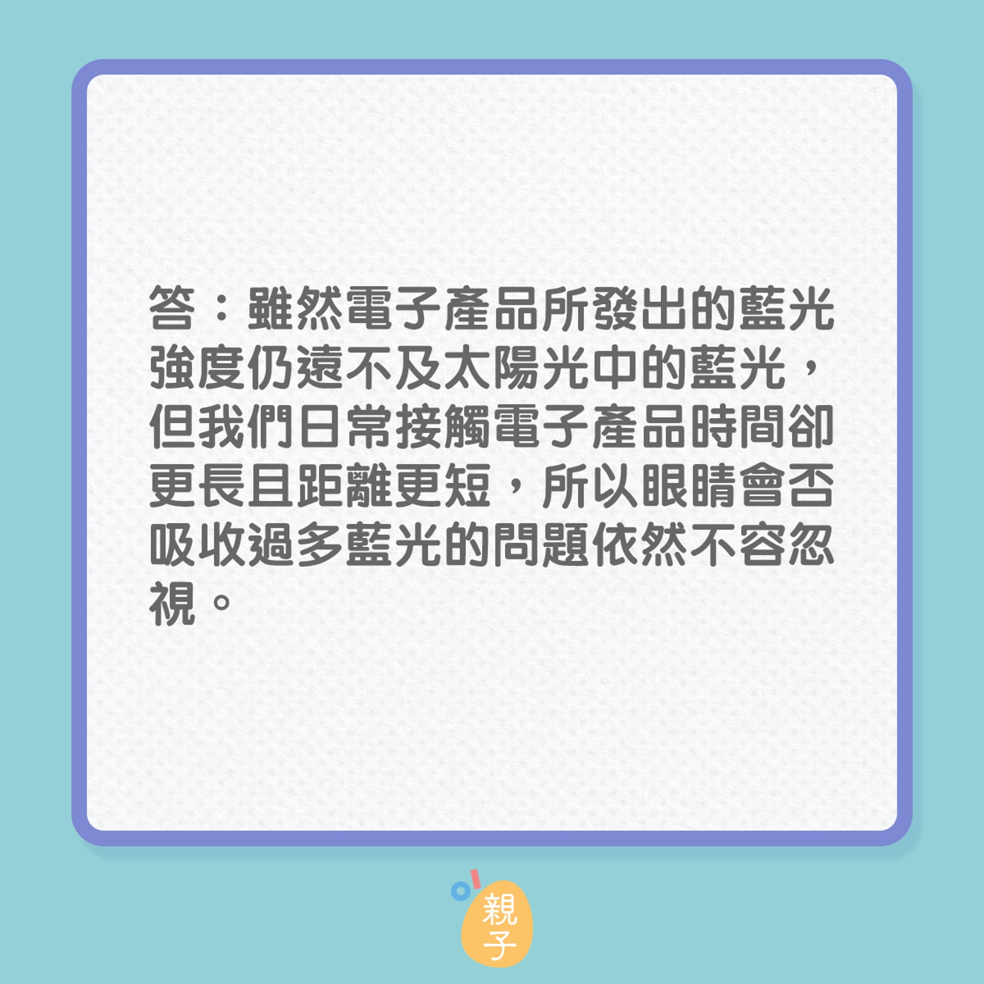另外,电子产品的出现,令小朋友在室内及进行近距离工作的时间变长,减少进行户外活动及接触自然光的机会,亦形成近视及其他问题。张嘉颖说:「所以电子产品带给儿童最重要的问题,并不一定是蓝光,而是其他生活习惯改变引起的问题,例如近视。建议家长应该定期带小朋友验眼,及早处理近视问题,可减低儿童将来患上严重眼疾的机会!」