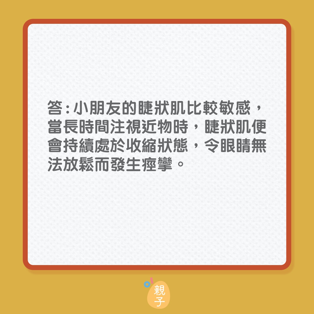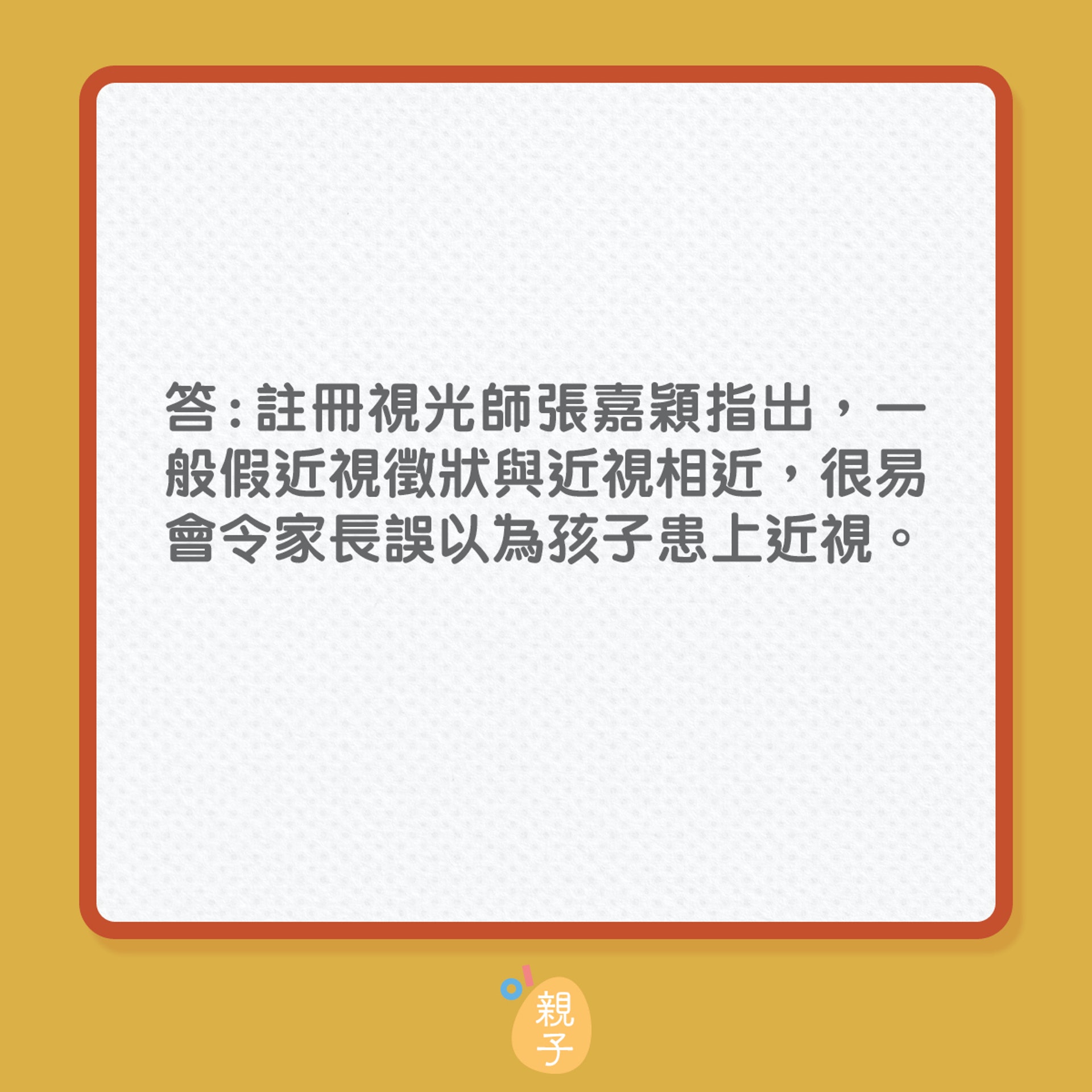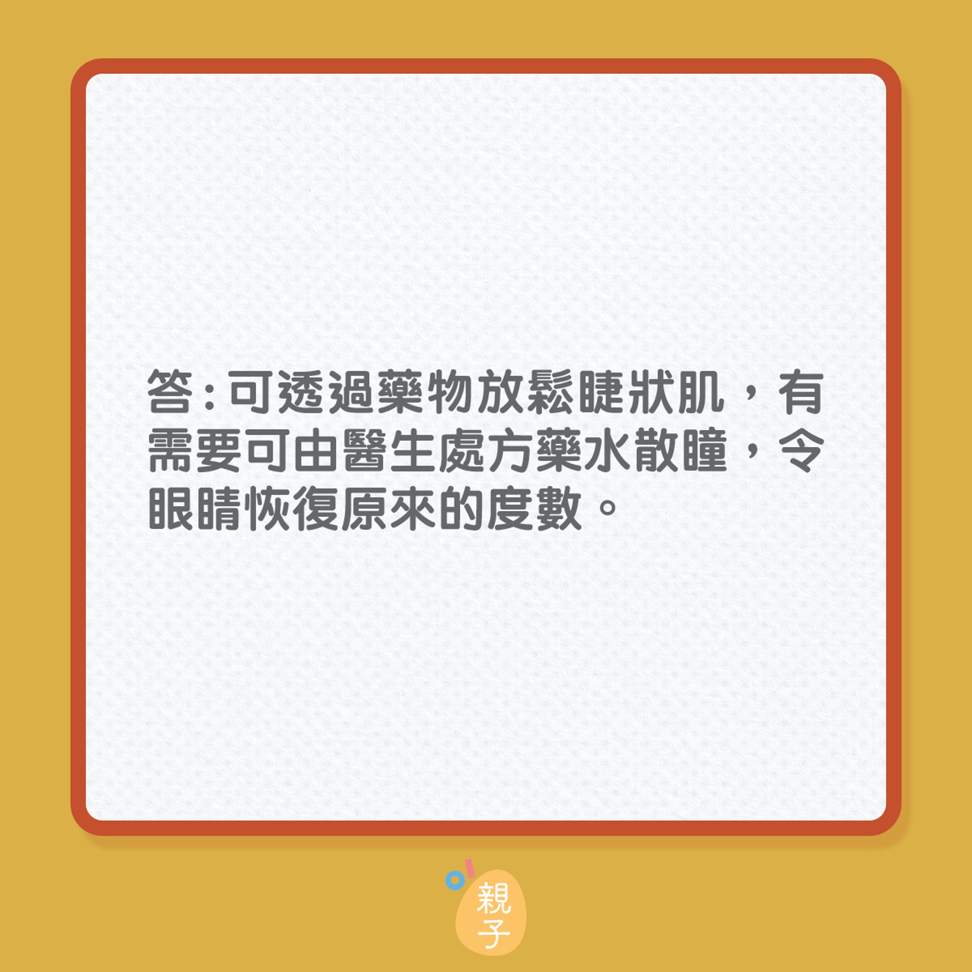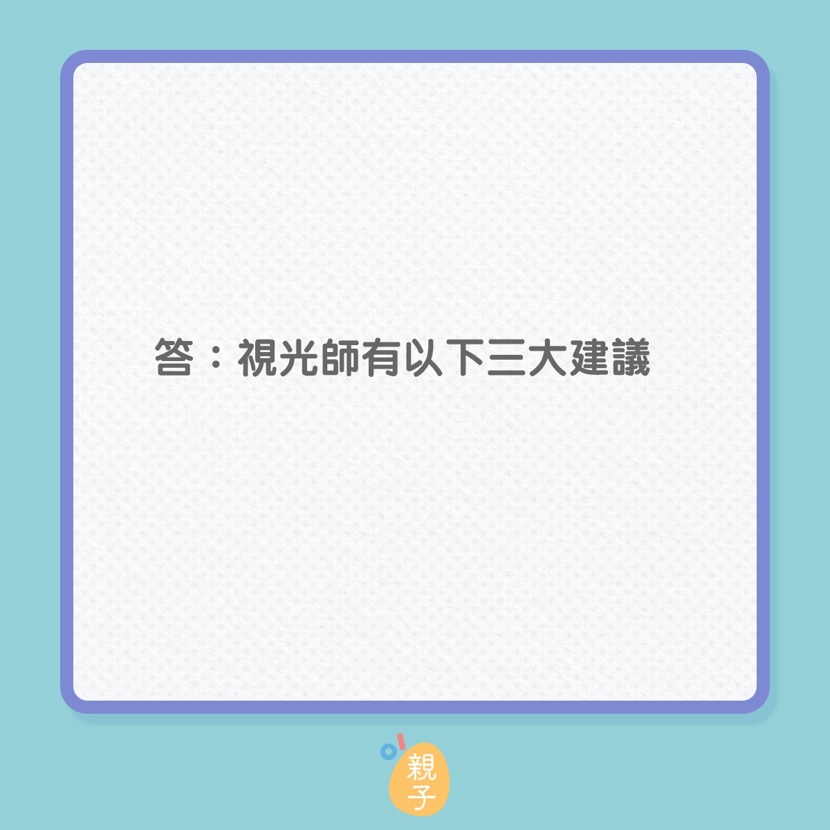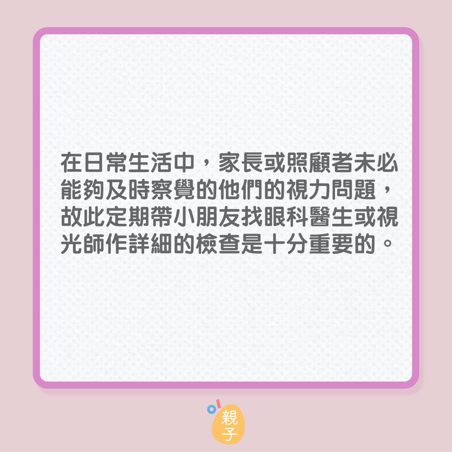 张嘉颖建议家长要带小朋友做一个全面的眼睛检查,除了要检查儿童双眼的协调能力、聚焦能力、立体感、颜色视觉,还会测量眼压、电脑验光检查、裂隙灯检查、眼底检查等,所以家长为子女安排眼睛检查时需要留意检查项目。他说控制近视除了使用眼药水和光学离焦眼镜之外,亦可以使用特制的隐形眼镜减慢儿童近视加深的速度,家长可因应需要为子女配戴。
